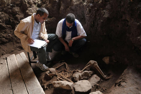 Arheoloogid Abdelouahed Ben-Ncer (vasakul) ja Youssef Bokbot skeletti uurimas